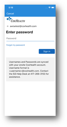 4. Enter in your CoxHealth network password and select Sign In: